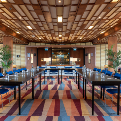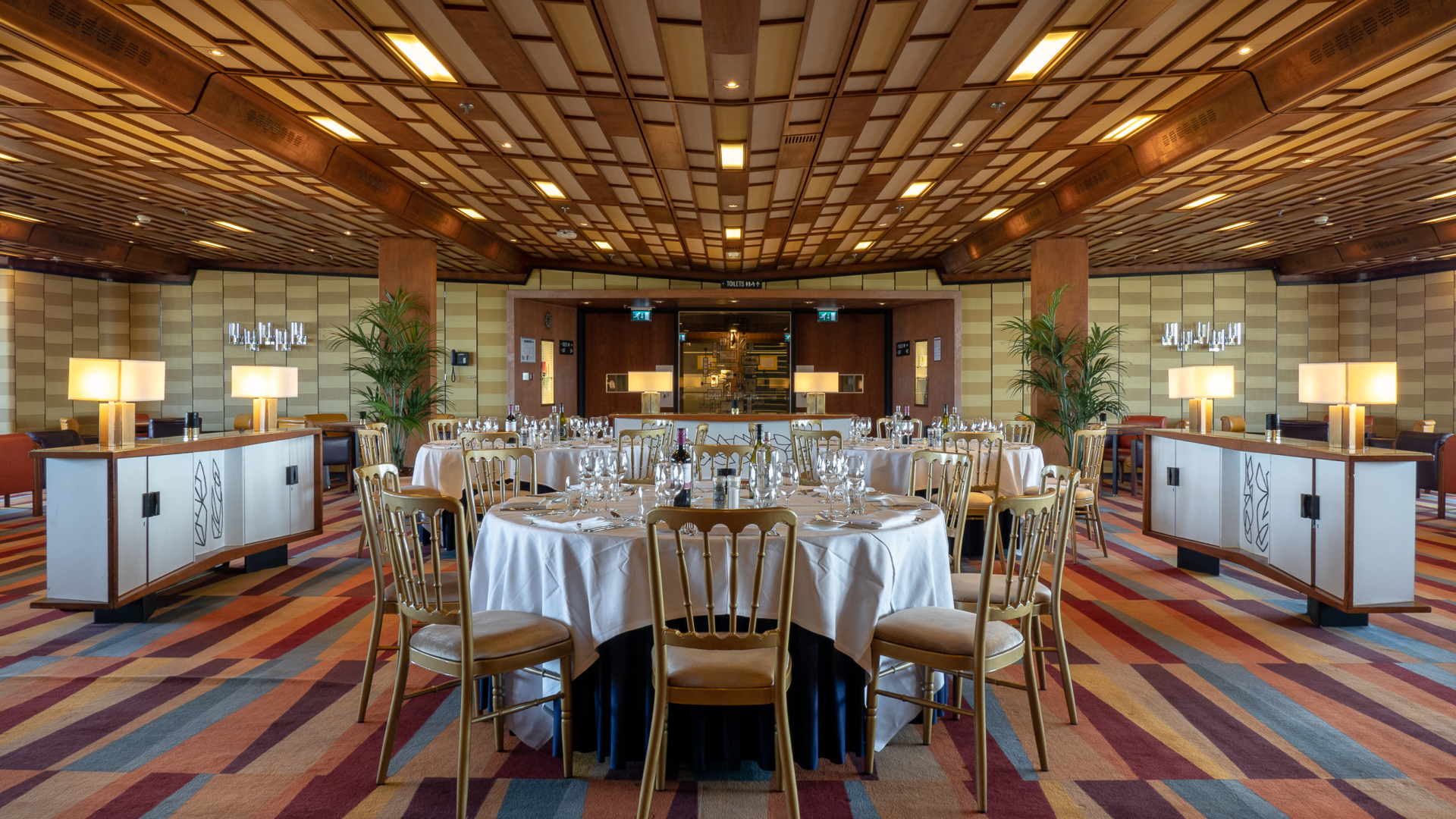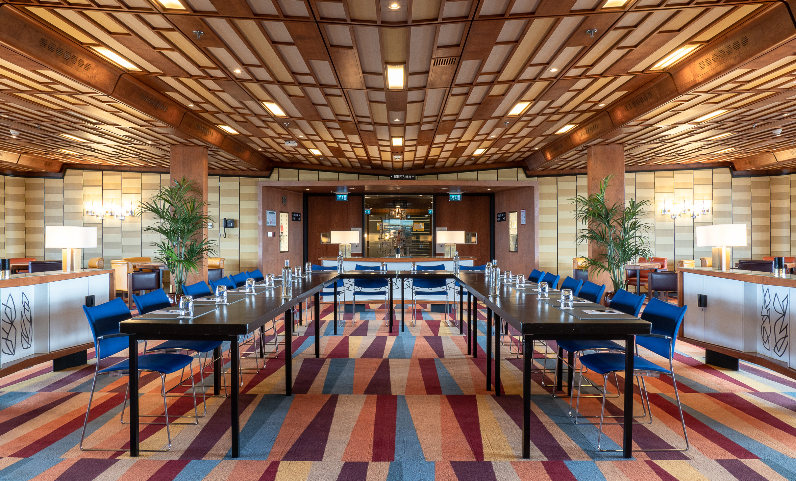 The former smoking area of the ss Rotterdam offers breathtaking views over the port and skyline of Rotterdam. In order to enjoy the view optimally, sofas have been placed in front of the windows. These are of a special design; the back rests can be turned around so that guests can enjoy the view to the outside or enjoy the view of the room. The ceiling with its dark and light sections, reminiscent of a Japanese room divider, is to be admired. This gives the Smoking Room its dynamic character. A curved screen of teak wood, designed by Everdine Schuurman-Henny, is decorated with a cultural relief depicting smoking figures from different continents.